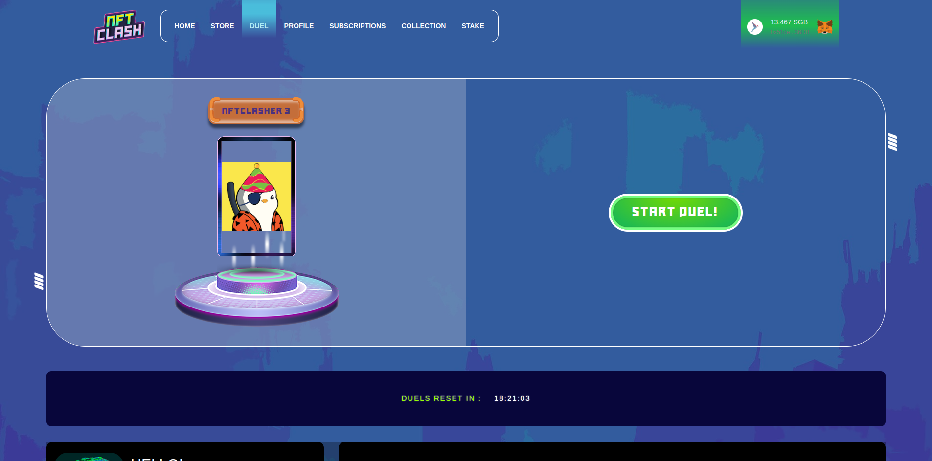 The Duel Page is where you prove your mettle, form alliances, and test your NFTs in exciting one-on-one fights. It's your path to glory and rewards in the ever-evolving world of NFT Clash.