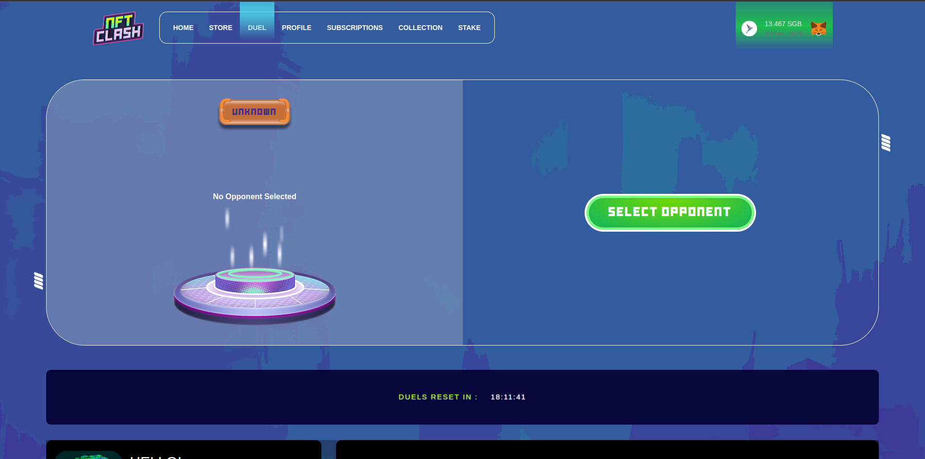 <figure><img src="https://2023474494-files.gitbook.io/~/files/v0/b/gitbook-x-prod.appspot.com/o/spaces%2FgFgK6UXKEOWND45RTazj%2Fuploads%2Fgit-blob-29b05b307c54715133fbfb7e0b905d13bbbd80af%2Fduel1.nft-clash.png?alt=media" alt=""><figcaption><p>after selecting opponent</p></figcaption></figure>