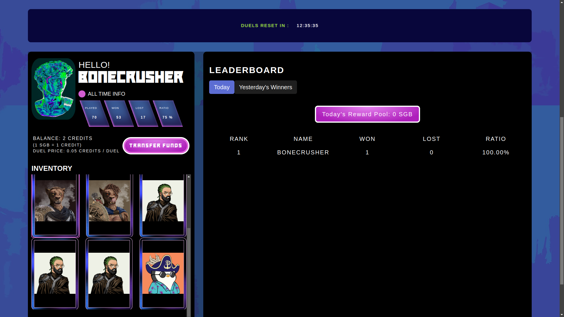 * **Balance:** Your in-game funds, which are used to initiate duels. If you need to add more funds, you can click the "Transfer Funds" button to make a deposit.